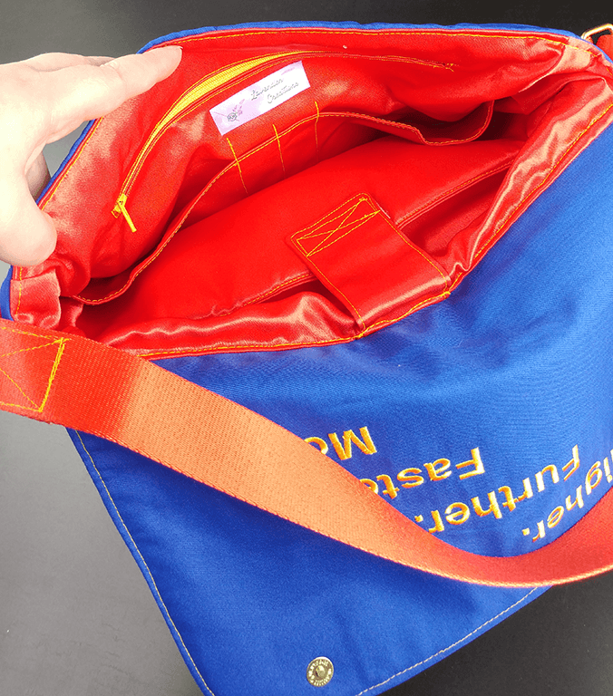 This messenger style bag measures 13” W x 10” H x 3” D. The exterior features custom embroidery and fabric piecing on both sides of the flap, and a large zipper pocket across the entire back of the bag. The interior is lined in bright red satin fabric and features a zipper pocket, divided slip pocket with pencil slots, and foam padded tablet/laptop pocket.