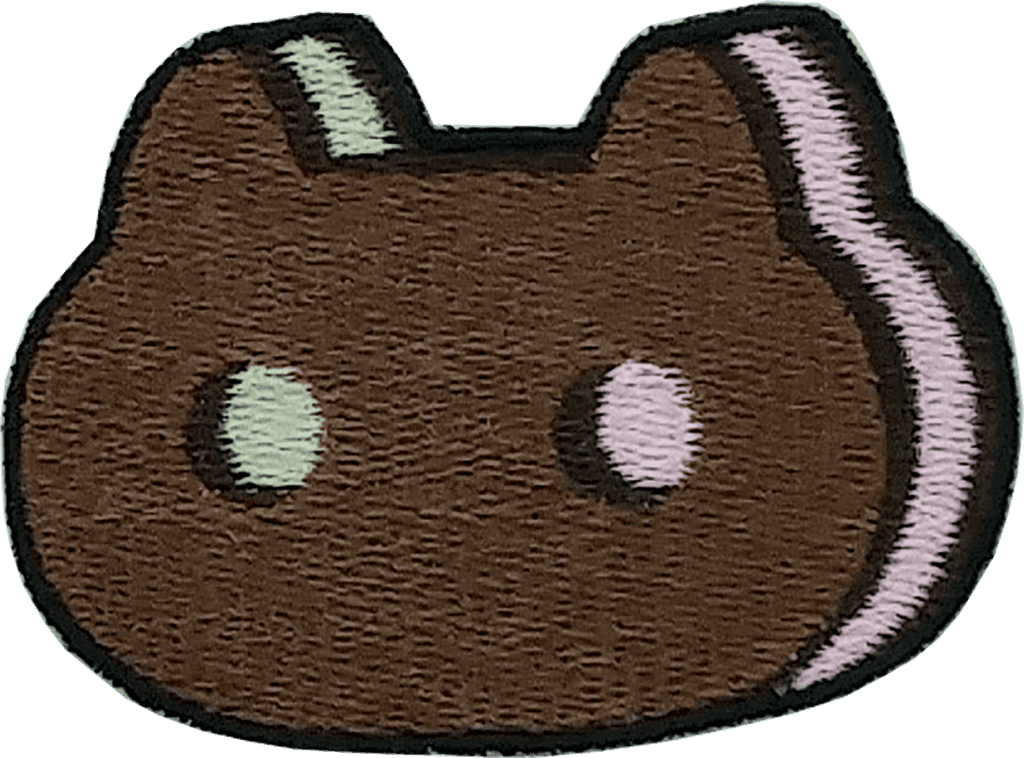 It's cookie cat in patch form! Patches are available in 2, 3, or 4 inch size and are made of polyester thread with fully enclosed edges and iron-on backing.