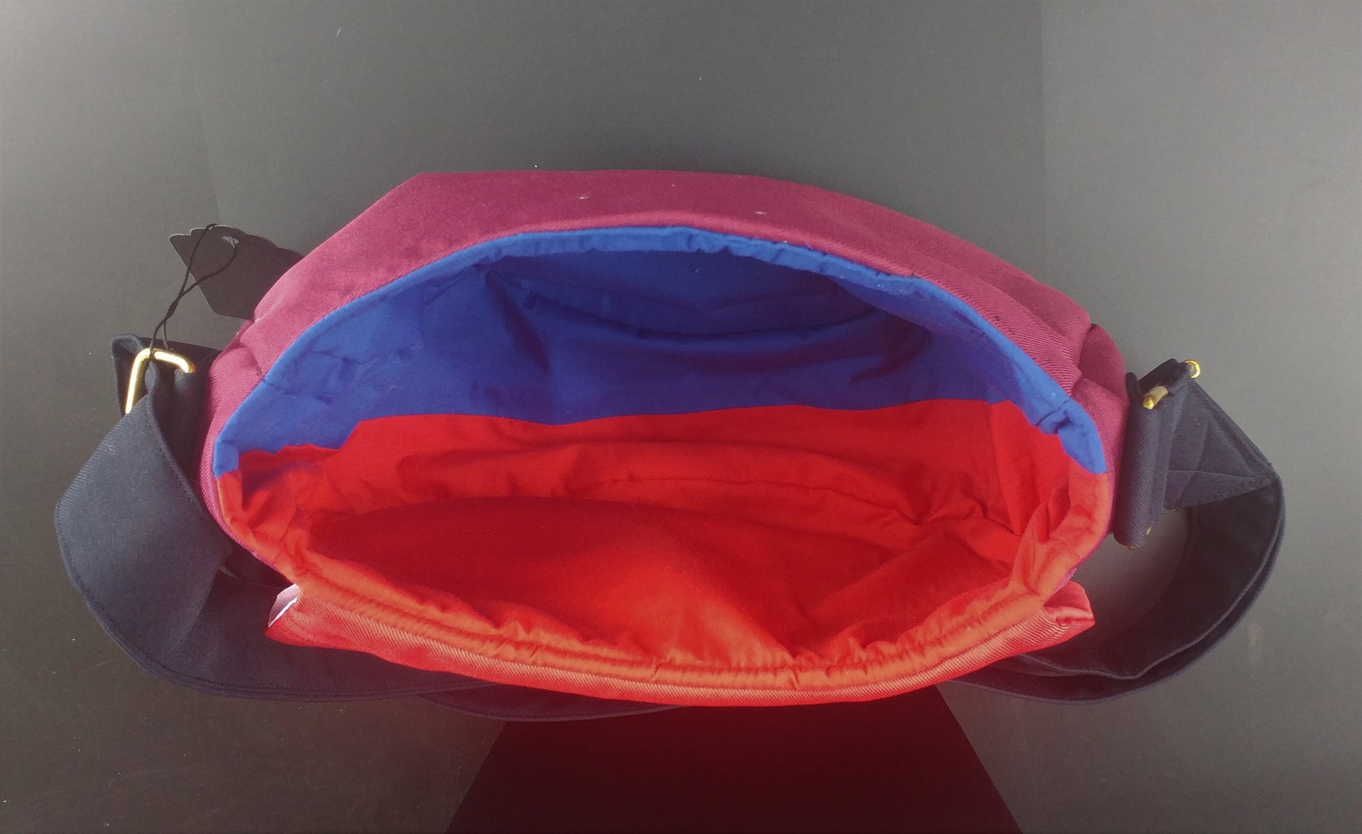 This half-circle purse measures approximately 11 inches wide x 8 inches tall x 4 inches deep. It features an exterior and interior zipper pocket with a large main compartment, magnet closing flap, and adjustable strap.