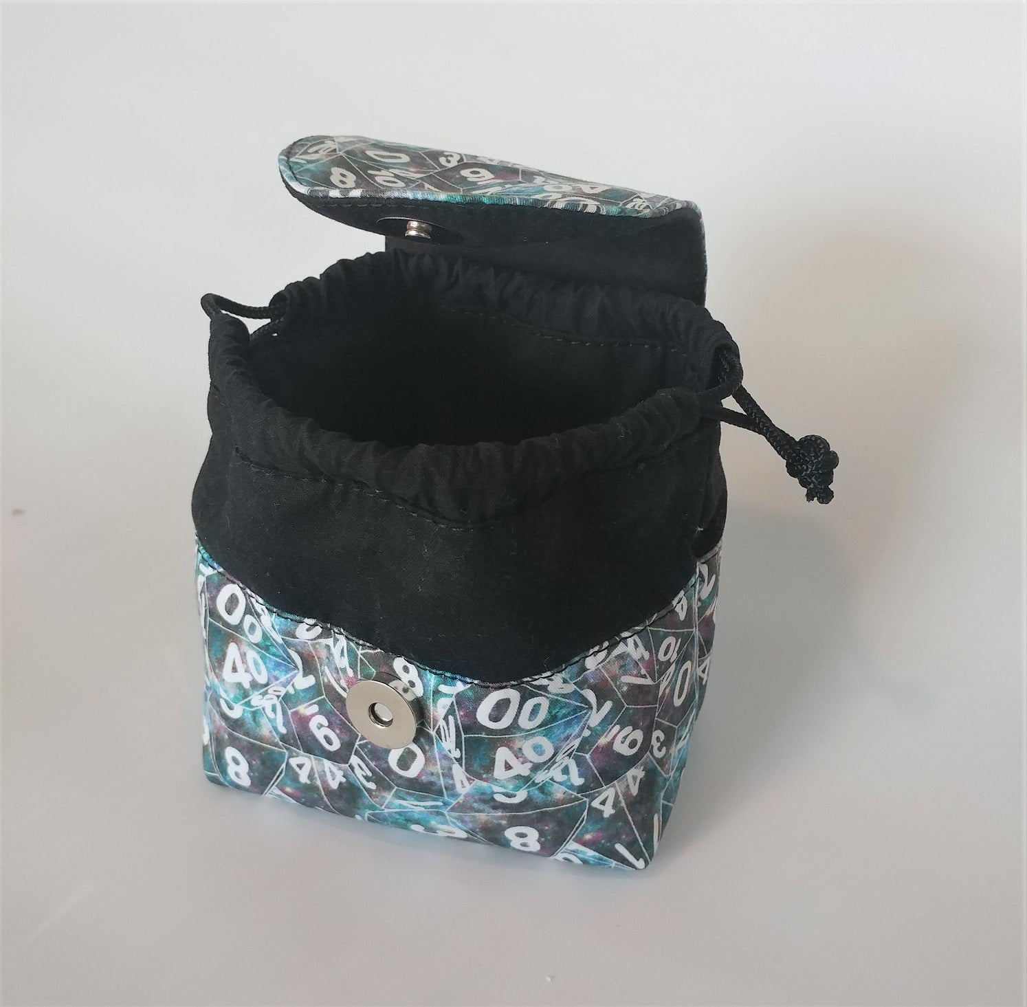 The Pandora is a mighty dice pouch ready for all your gaming needs!  Equipped with both a paracord drawstring and a sturdy magnetic flap, this wide base dice bag can hold a huge amount of dice or other gaming accessories. The pouch stands 5 inches tall when fully open but cinches down to about 4 inches, the base of the pouch measures 5 x 3 inches.