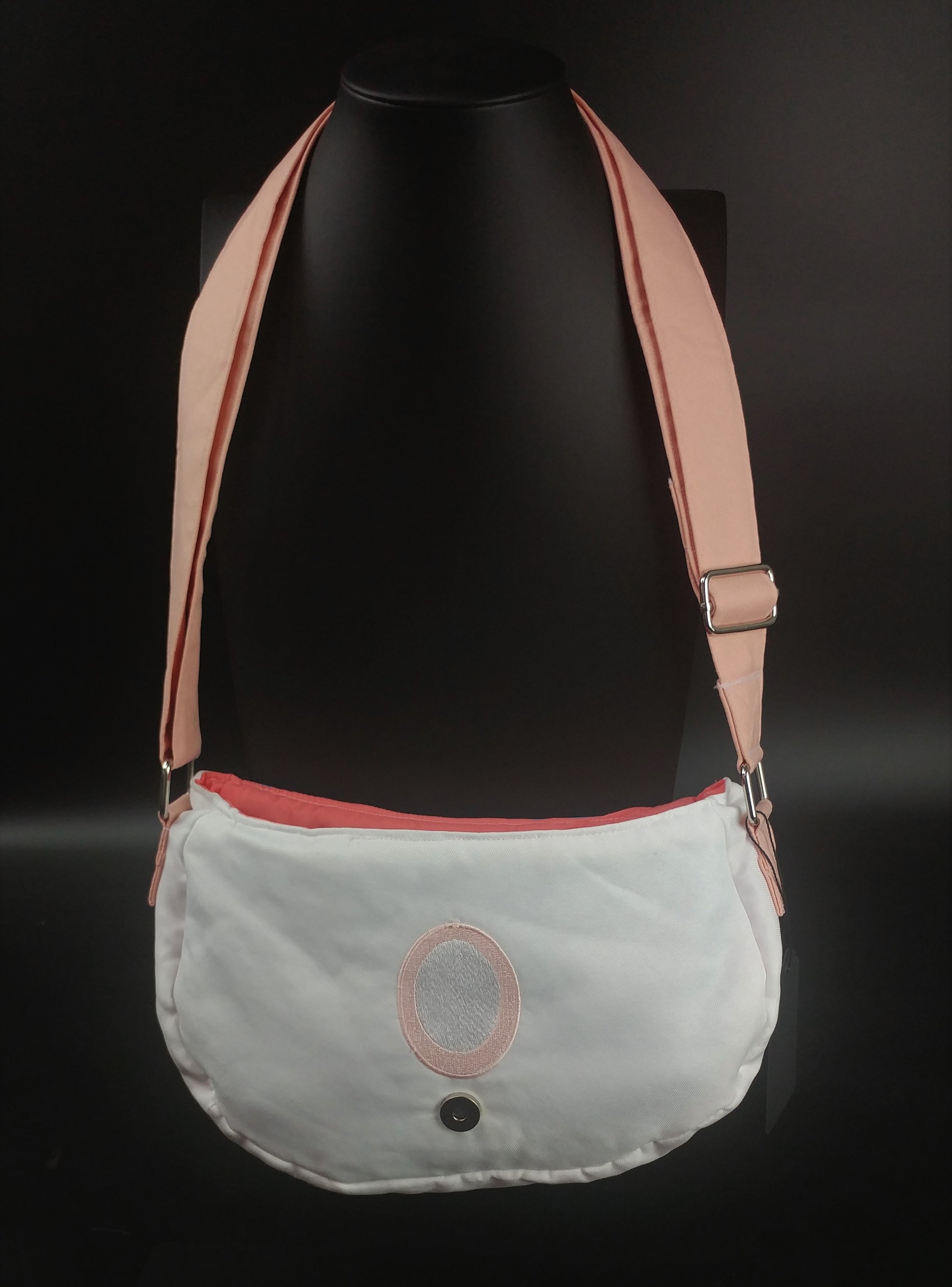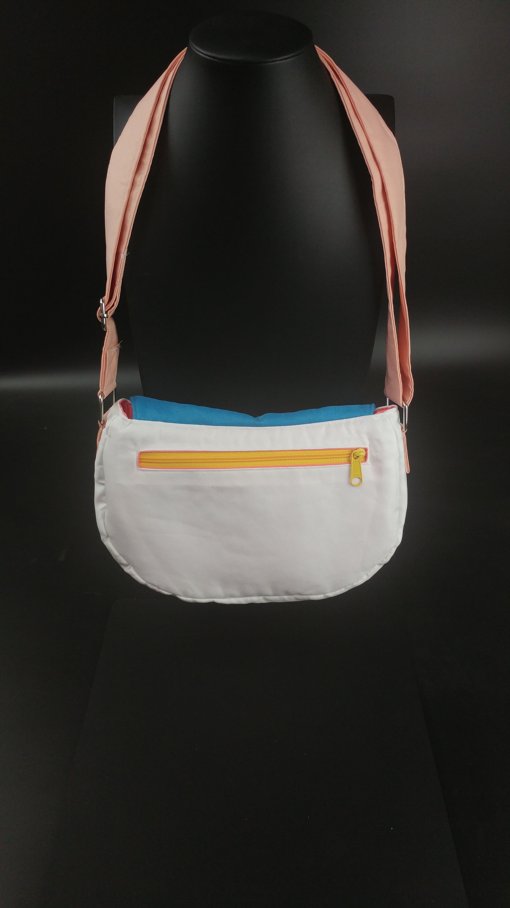 This half-circle purse measures approximately 11 inches wide x 8 inches tall x 4 inches deep. It features an exterior and interior zipper pocket with a large main compartment, magnet closing flap, and adjustable strap as well as embroidered gem detail hidden under the flap.